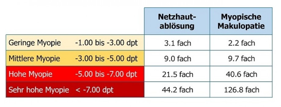Folgende Tabelle zeigt das erhöhte Risiko von Augenerkrankungen durch Kurzsichtigkeit: